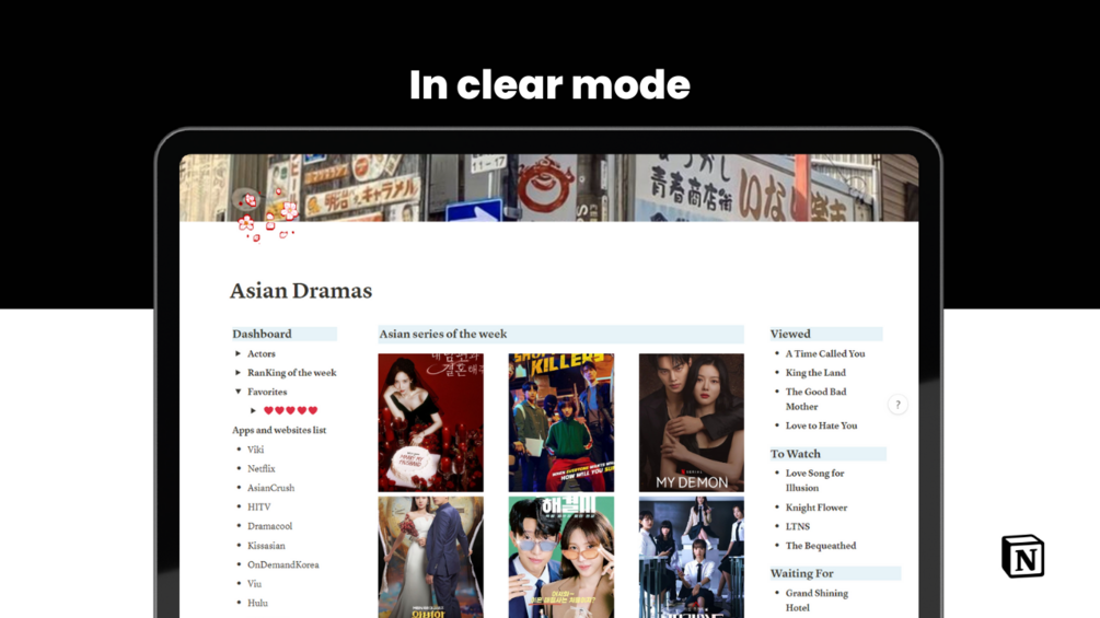 Notion's Asian Series Tracking Template is a tool designed to help you keep track of the Asian dramas you're watching in an organized and up-to-date manner. Whether you enjoy K-dramas, J-dramas, C-dramas or any other Asian productions, this template gives you an efficient way to sort, rate and track your experiences in detail.